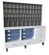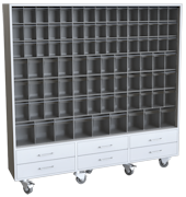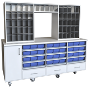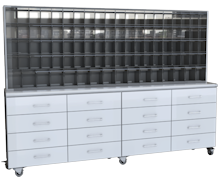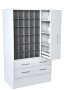 Muebles equipados con gavetas tipo tolva para el almacenamiento limpio y clasificado.