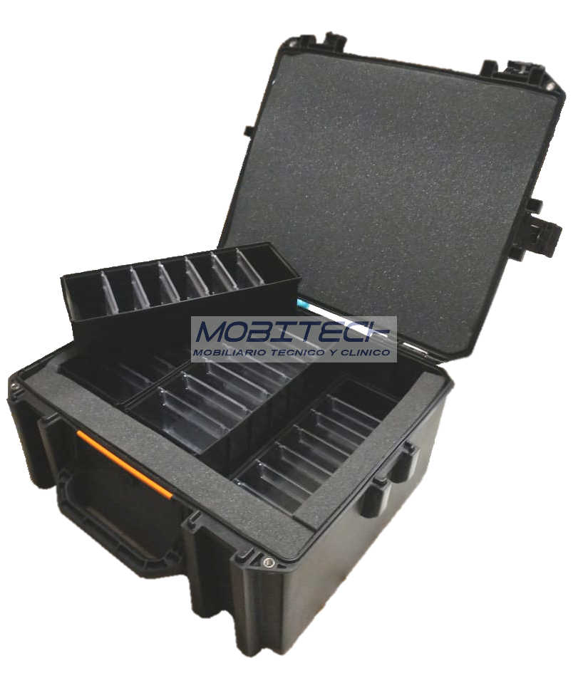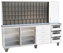 Carro para transporte de medicamentos con gavetas, cajas y canastos. Gabinete para controlados.